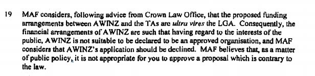 Except AWINZ did not exist in any manner or form. Neil Wells the council manager , was a barrister ( he no longer is ) he had been heavily involved in the drafting of the animal welfare act and had tailored it to facilitate his own business plan.
