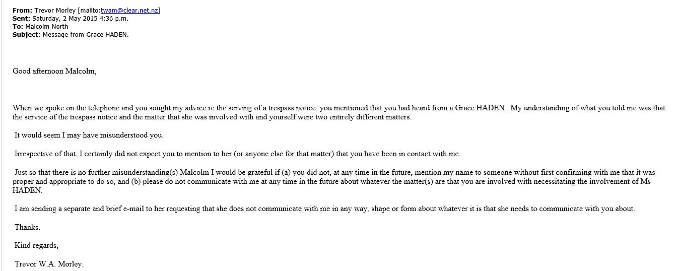 2008 I was the secretary of the NZIPI the new Zealand institute of professional Investigators , Trevor Morley was the President .There were two people in the institute who he wanted to get rid of as members, but hey were unable to remove them for any breach of ethics. So Morley decided to change the rules so that we could effectively kick these persons out , some three years after the alleged incident . I felt that it was unethical to change the rules to remove some one and left the society . Today most former police officer PI’s who have integrity choose not to belong to the NZIPI . Trevor Morley has been in contact with Malcolm North as shown in this email