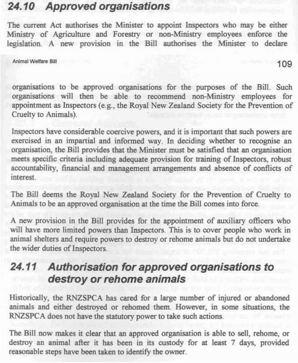 In a hand book written for animal welfare students by Mr Wells he himself gives an outline of what approved organisations are note that it states “In deciding whether to recognise an organisation, the Bill provides that the Minister must be satisfied that an organisation meets specific criteria including adequate provision for training of Inspectors, robust accountability, financial and management arrangements and absence of conflicts of interest.”
